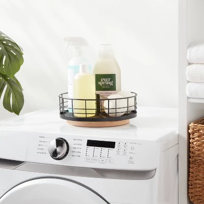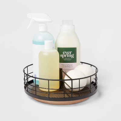Store everyday items on a countertop while keeping them easily accessible with this Wire Divided Turntable with Natural Wood from Brightroomâ˘. This divided turntable has a round silhouette that makes it ideal for organizing condiments in the refrigerator and household items in the bathroom cabinet. This decorative storage basket has a open black wire design with wooden base that adds a new level of stylish convenience to your home. Simply spot or wipe clean to keep it looking great.