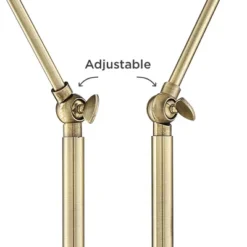 An energy-efficient LED desk lamp in a sleek Mid-Century Modern style. This lamp features a round base and conical shades in a flat black finish, with arms that come in an antique brass finish for an elegant golden look. Swivel joints on the arms and shades allow you to easily adjust and re-target the direction of the lighting.
