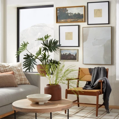 Liven up your living spaces with this Set of 2 Vases Framed Under Glass from Threshold⢠designed with Studio McGee. This set of 2 framed pieces of wall art under glass can be hung on an empty patch of wall to enhance the space and soften the room. Each piece features a line sketch of a vase on tan paper contained in a black wood composite frame for a minimalist style that will fit most decor styles neatly, and the glass front helps protect the art from dust and damage.