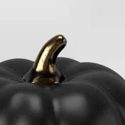 Spruce up your fall-themed display with this Set of 3 Small Ceramic Pumpkins with Gold Stem from Thresholdâ˘. This set of three small pumpkin figurines makes a perfect addition to your Halloween decor. Each piece features a sculpted shape in a black ceramic finish with gold stem detail for a decorative touch of shine. Place them on an entryway table, shelf or windowsill with other decor pieces to complete your seasonal display.