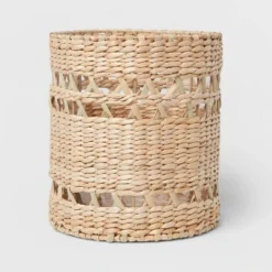Maintain a clean bathroom space while adding a touch of natural flair with this Woven Waste Can from Thresholdâ˘. This natural waste can showcases a beautifully woven pattern with raffia-like accents to lend an artistic flair to your space. Designed in a round shape, this waste can features an open top construction for easy disposal of trash.